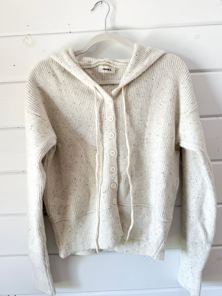super soft, ribbed sweater in a neutral off white color featuring button closure and a hood