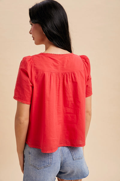 beautiful soft red, short sleeve blouse featuring lace inset accents, lace trim along the neckline, and a functional button down front